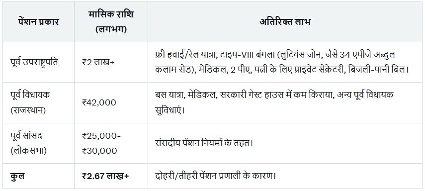 राजस्थान में सांसद-विधायक दोनों रहे नेताओं को दोहरी पेंशन मिल सकती है। धनखड़ को लोकसभा सांसद के रूप में भी पेंशन (लगभग ₹25,000-₹30,000) मिलती है। कुल मिलाकर:उपराष्ट्रपति पेंशन: ₹2 लाख+ मासिक (उपराष्ट्रपति वेतन का 50-60%, जिसमें फ्री हवाई/रेल यात्रा, टाइप-VIII बंगला, मेडिकल सुविधाएं, 2 पीए आदि शामिल)। कुल अनुमानित ₹2.5 लाख+ मासिक पेंशन + सुविधाएं।